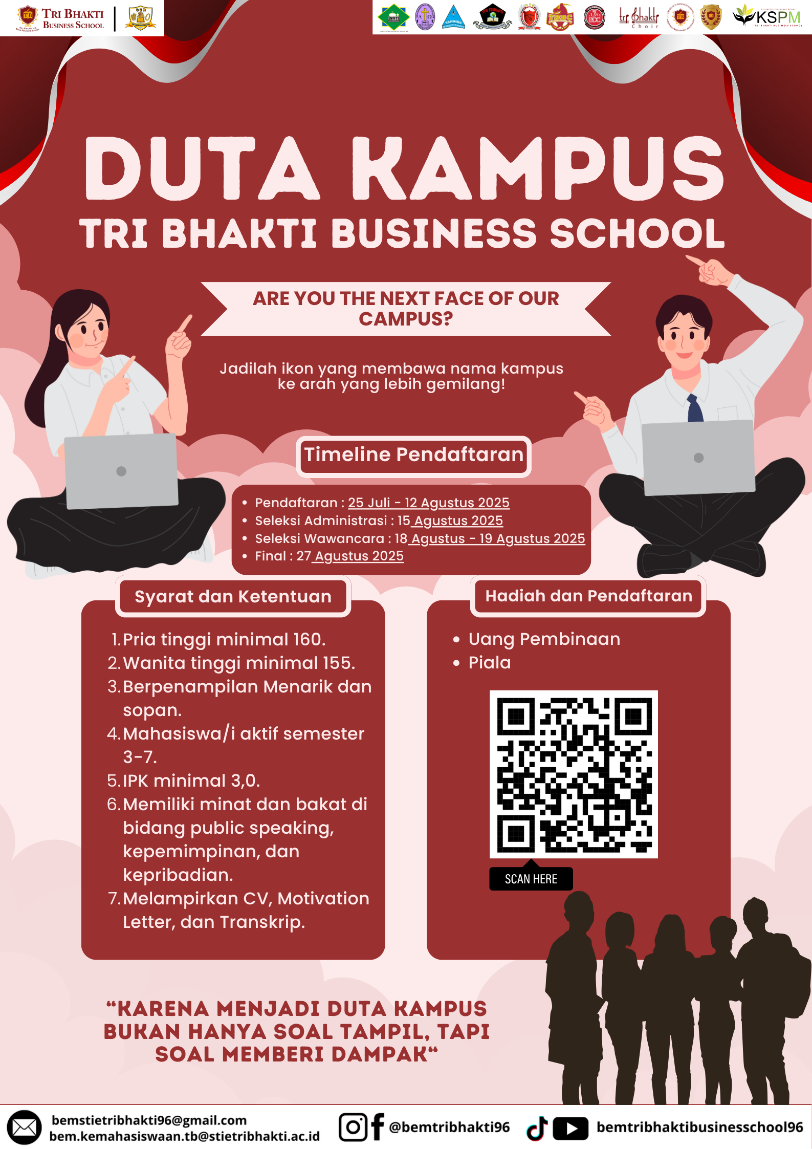 Tri Bhakti Business School kembali membuka ajang bergengsi tahunan untuk para mahasiswa aktif yang ingin menjadi representasi kampus melalui pemilihan Duta Kampus Tri Bhakti Business School 2025. Acara ini merupakan wadah untuk mencari ikon mahasiswa yang tidak hanya memiliki penampilan menarik, tetapi juga mampu memberikan dampak positif melalui kepemimpinan, komunikasi publik, dan kepribadian yang inspiratif.