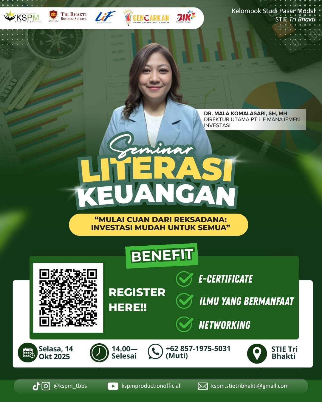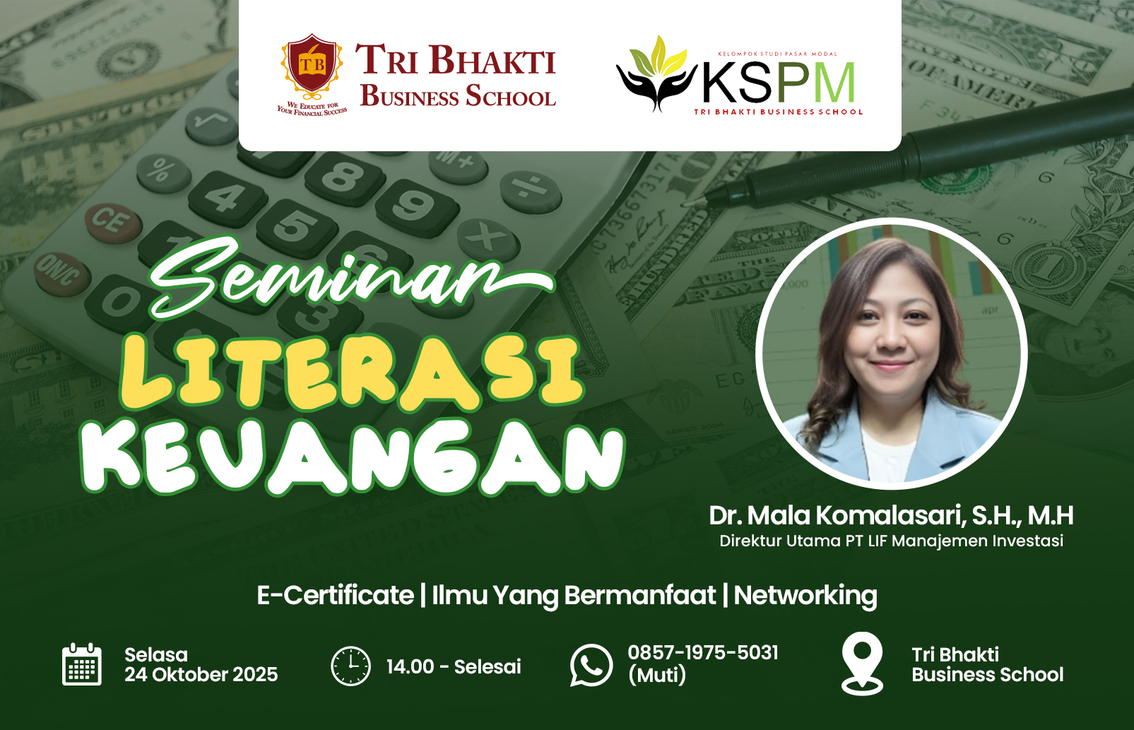 Kelompok Studi Pasar Modal (KSPM) – Galeri Investasi Bursa Efek Indonesia (GI BEI) Tri Bhakti Business School akan kembali mengadakan kegiatan Seminar Literasi Keuangan yang bertujuan untuk meningkatkan pemahaman mahasiswa mengenai dunia investasi dan pasar modal.