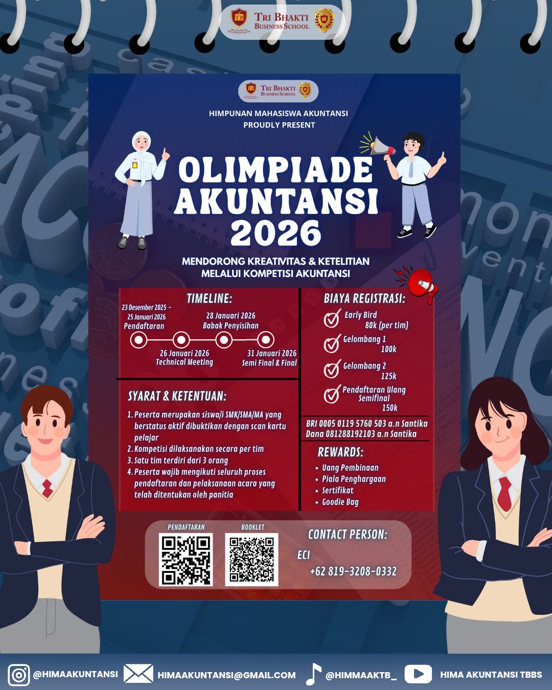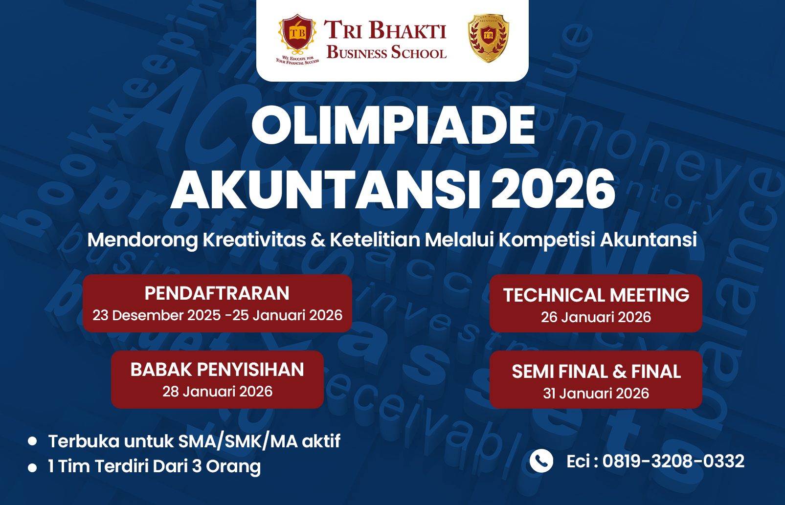 Himpunan Mahasiswa Akuntansi (HIMMA) Tri Bhakti Business School kembali menyelenggarakan Olimpiade Akuntansi 2026, sebuah kompetisi akademik yang ditujukan bagi pelajar tingkat SMA/SMK/MA. Kegiatan ini dirancang sebagai wadah bagi generasi muda untuk mengasah kreativitas, ketelitian, serta kemampuan berpikir analitis di bidang akuntansi dalam suasana kompetitif dan edukatif.