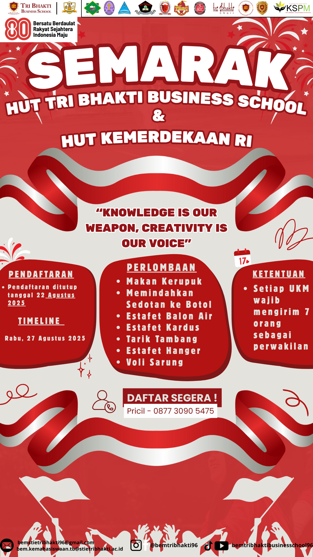 Dalam rangka memeriahkan Hari Ulang Tahun Tri Bhakti Business School sekaligus memperingati Hari Ulang Tahun ke-80 Republik Indonesia, Badan Eksekutif Mahasiswa Tri Bhakti Business School akan menyelenggarakan rangkaian kegiatan lomba.